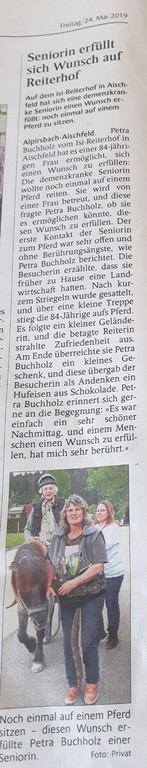 Und diesen Wunsch erfüllte sich eine 84-Jährige Frau auf unserem Reiterhof. In Ihren jungen Jahren ritt Sie sehr gerne und es bereitete uns viel Freude, Ihren größten Wunsch noch einmal zu realisieren.